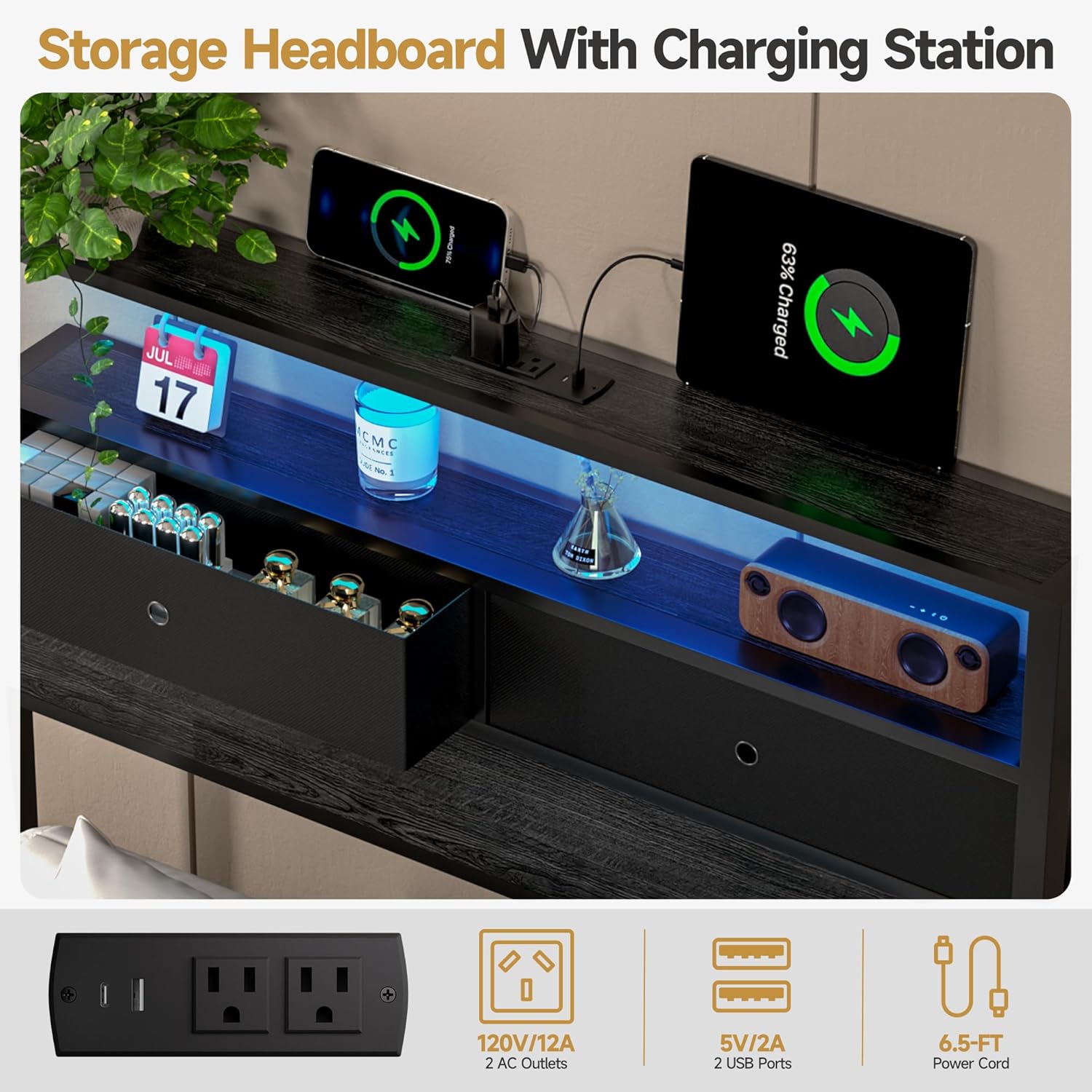 The wood headboard stands 43.3 inches tall and incorporates open storage shelves for books, alarm clocks, or decorative items , essentially replacing a nightstand. The integrated RGB LED light strip is app-controlled, letting you cycle through colors to match your room aesthetics or set a relaxing mood.