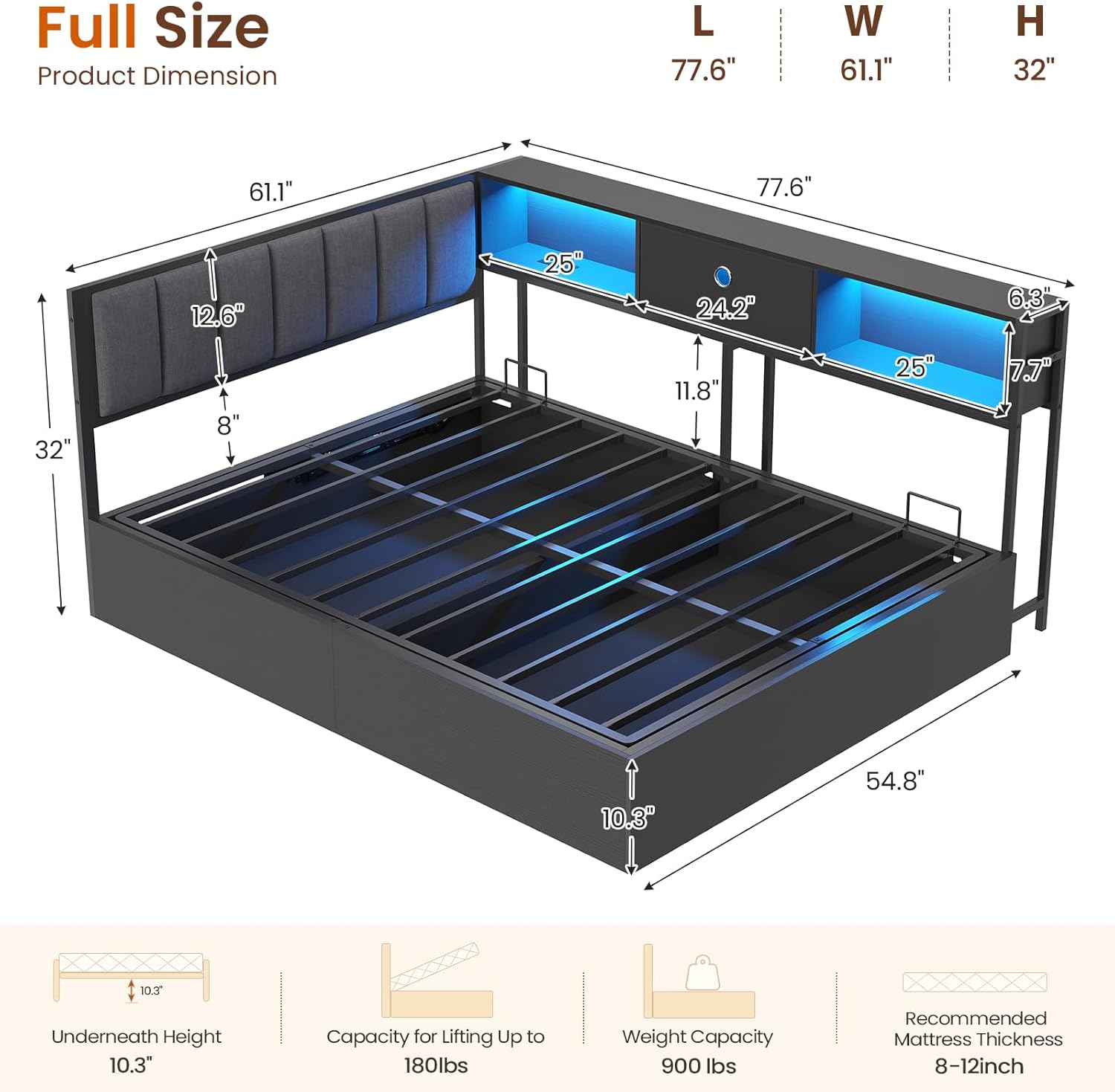 The hydraulic lift storage is the standout , gas struts raise the mattress platform to reveal a deep storage compartment, plus there's 1 additional drawer for smaller items. Built-in LED lights offer ambient or accent lighting, while the integrated charging station keeps phones and tablets powered without a separate nightstand.