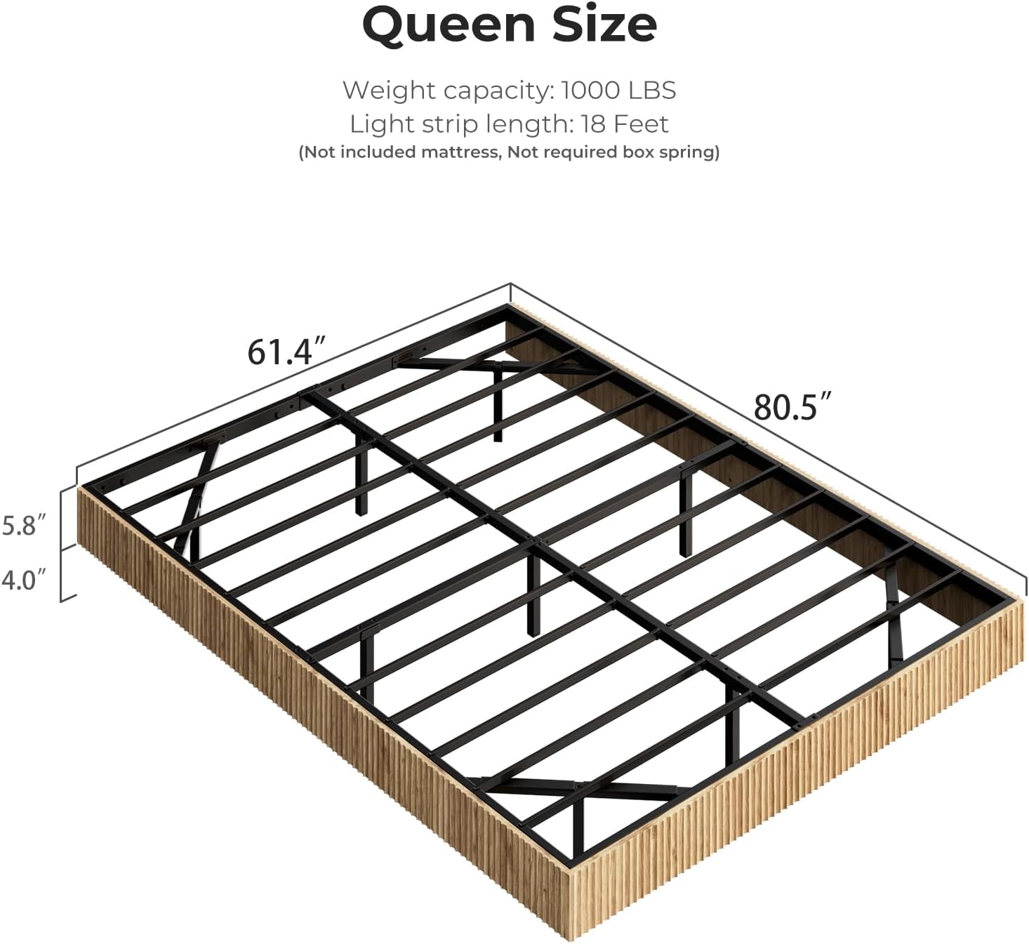 Built on a strong metal frame with a painted finish, this platform bed frame supports up to 1,000 lbs , more than enough for two adults plus a heavy mattress. The heavy-duty construction keeps the frame rigid and stable at just 52.7 lbs total weight, making it manageable to move.