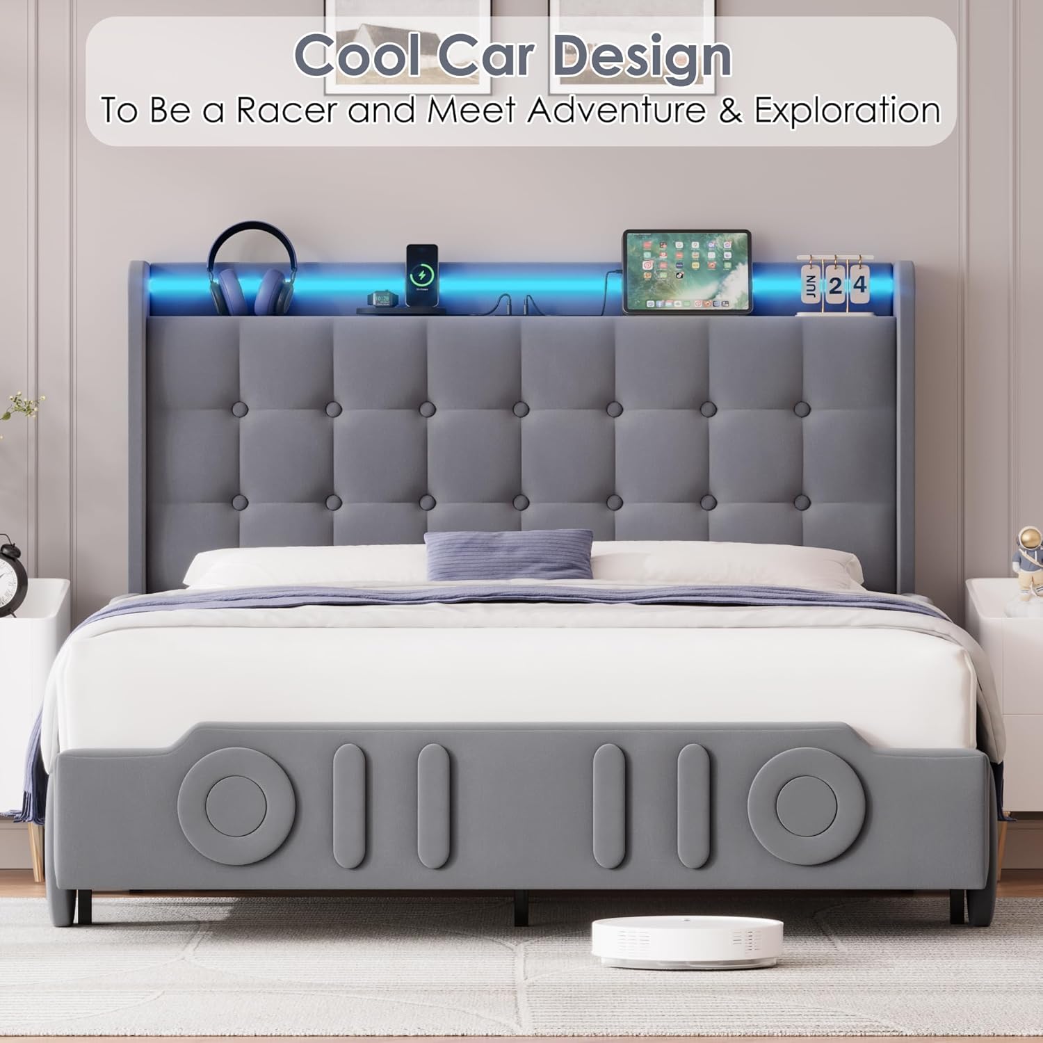 The Keyluv Full Car Bed Frame turns any kid's room into a racer adventure base with its eye-catching car-shaped design complete with LED lights, a grille, headlamps, and wheels. Built on a steel frame with an 850 lb weight capacity and velvet tufted headboard, it delivers both whimsical style and serious durability for growing kids.