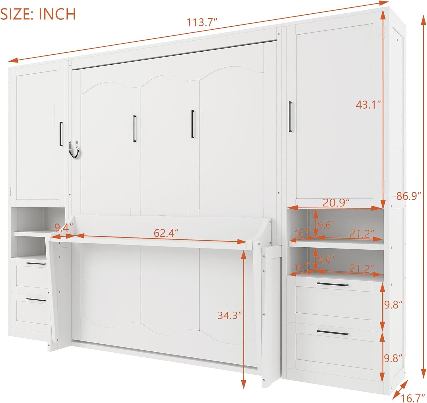 Queen Size Murphy Bed with Storage Shelf & Support Plate for Adult,Girls,Boys,Wood Hidden Wall Bed Cabinet,Space-Saving,No Box Spring Needed, White