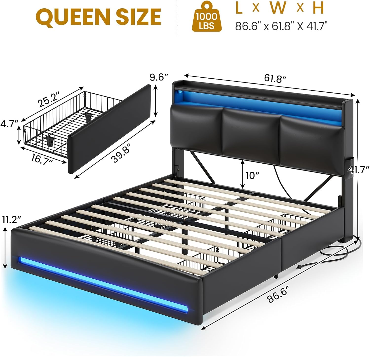 At 86.6 x 61.8 inches, the footprint is standard for a Queen platform.